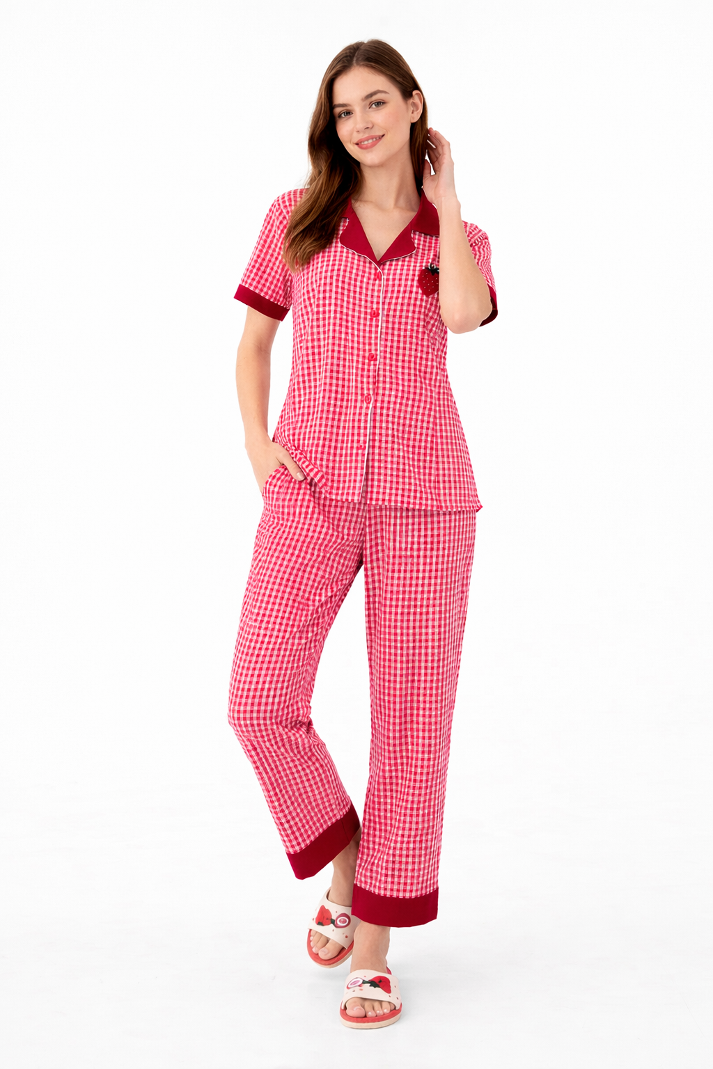 الطقم يأتي بتصميم كاروهات جذاب مع تفاصيل أنيقة في الياقة والأكمام تضيف لمسة مميزة لإطلالتك اليومية.