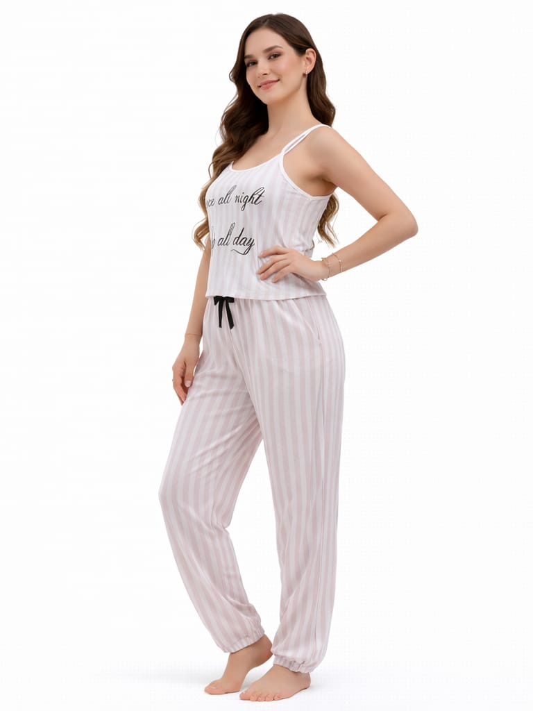 بيجامة حريمي أنيقة بتصميم مخطط عصري وتوب بحمالات رفيعة مع بنطلون مريح. خامة ناعمة تمنحك إحساس بالراحة طوال اليوم ومناسبة للبيت والنوم.