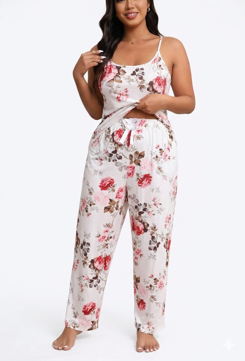 بيجامة الورد الكلاسيك: الرقة كلها في اللون الأبيض الهادي مع نقاشات ورود باللون الأحمر والوردي.. شياكة مفيش بعدها.