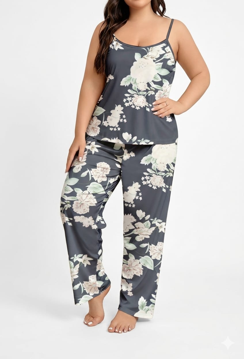 بيجامة الورد الفحمية: لعشاق الفخامة، اللون الرمادي الغامق مع الورود الكريمي الكبيرة بيدي طلة هادية وراقية جداً.