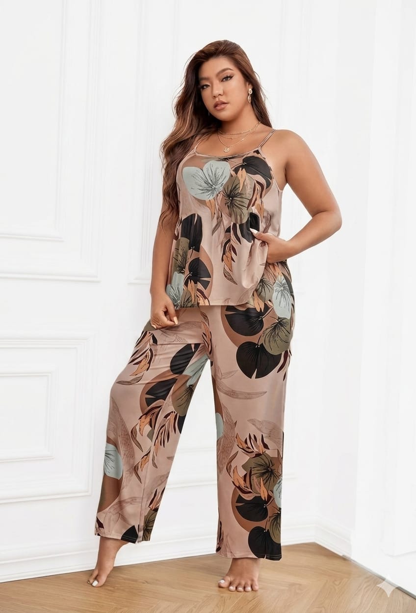 بيجامة الأوراق الاستوائية: للبنات اللي بيحبوا الاختلاف، لون توبي (Taupe) شيك جداً مع نقاشات أوراق شجر كبيرة بستايل “Modern”.