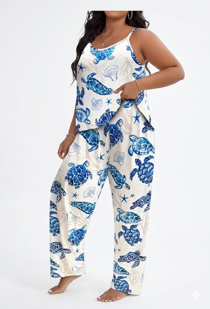 بيجامة أعماق البحار: طقم “Cozy” جداً باللون الأبيض (الأوف وايت) ومنقوش بسلاحف وقواقع زرقاء.. بجد بيجامة كلها طاقة وهدوء.