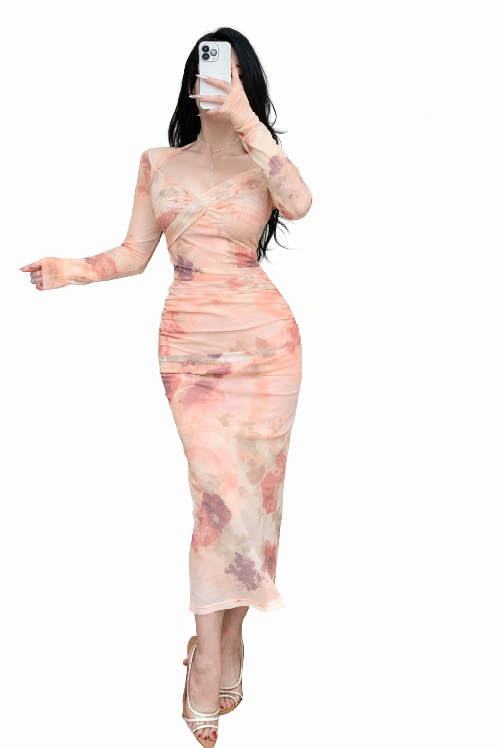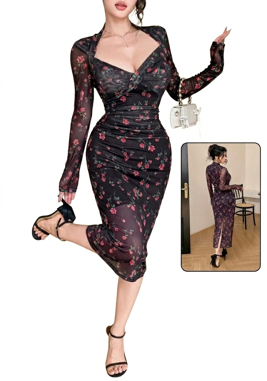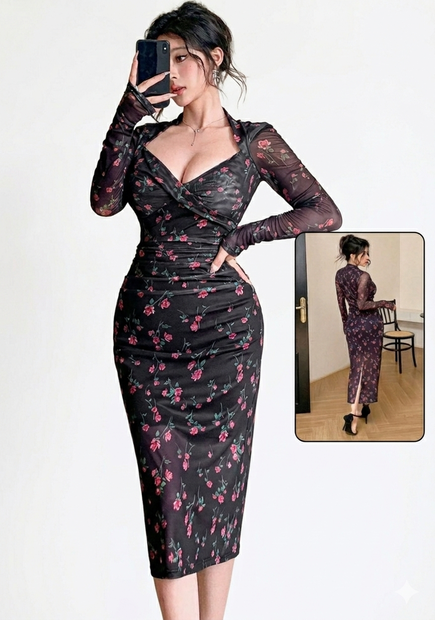 التصميم بفتحة صدر متقاطعة أنثوية وأكمام طويلة شفافة خفيفة تضيف لمسة راقية ومميزة، مع قصة ميدي تناسب الخروجات، السهرات الخفيفة، أو حتى المناسبات الخاصة.