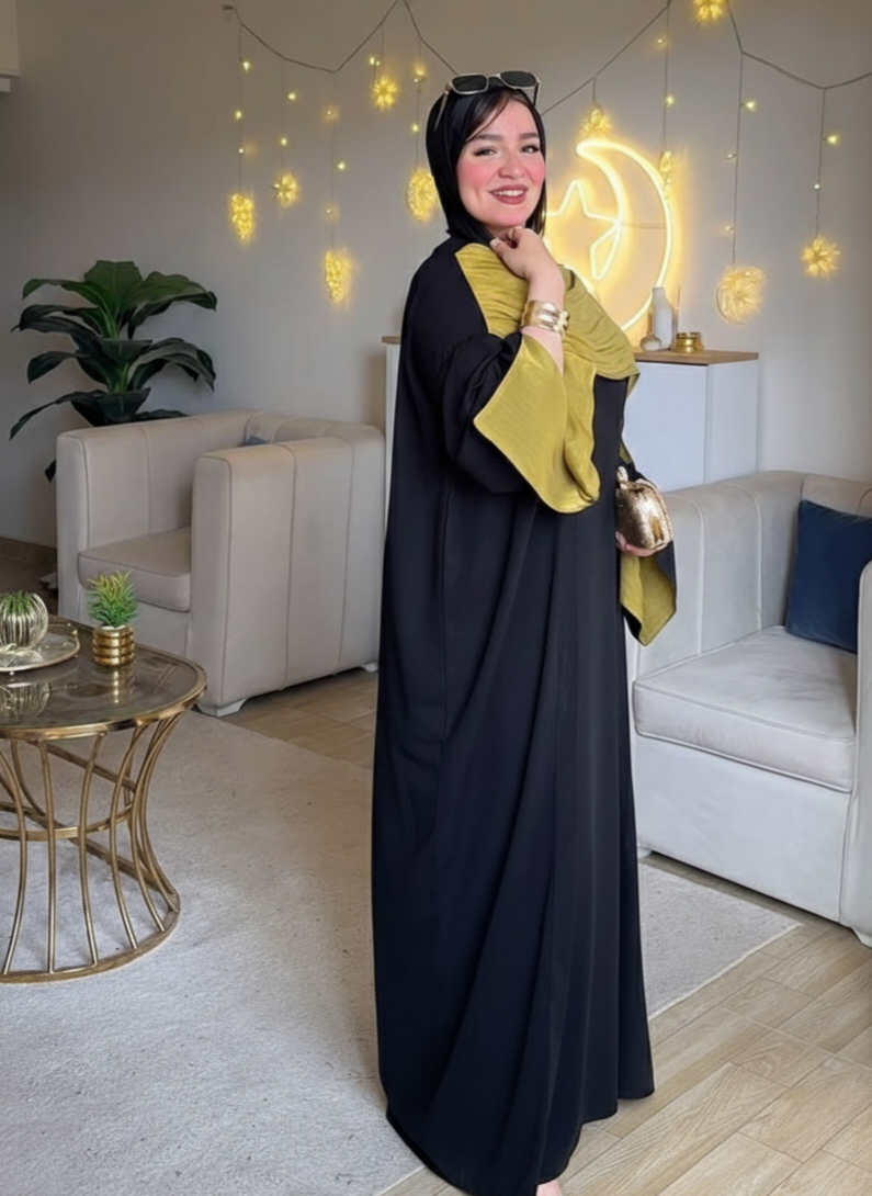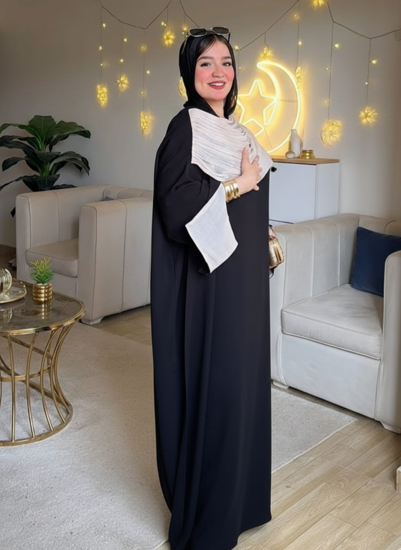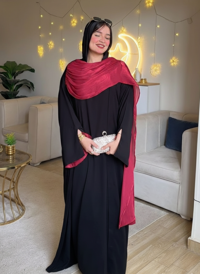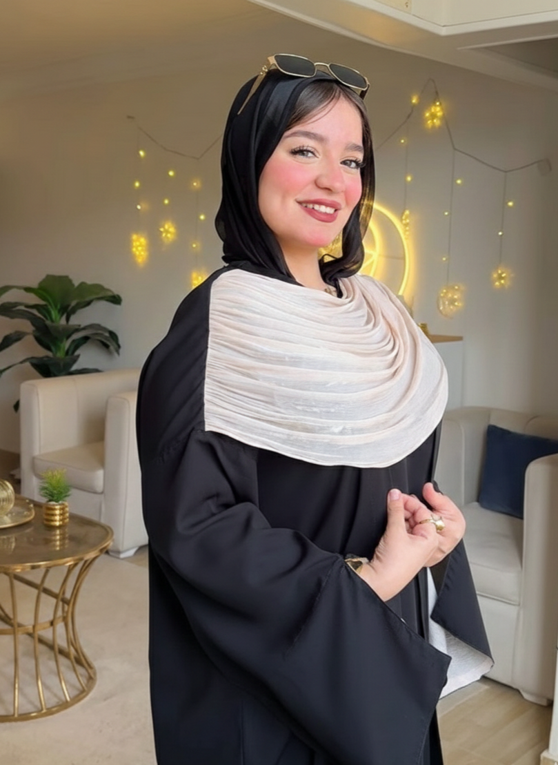 Model: Two-Piece Abaya Set (Basic Dress + Open Organza Cardigan)